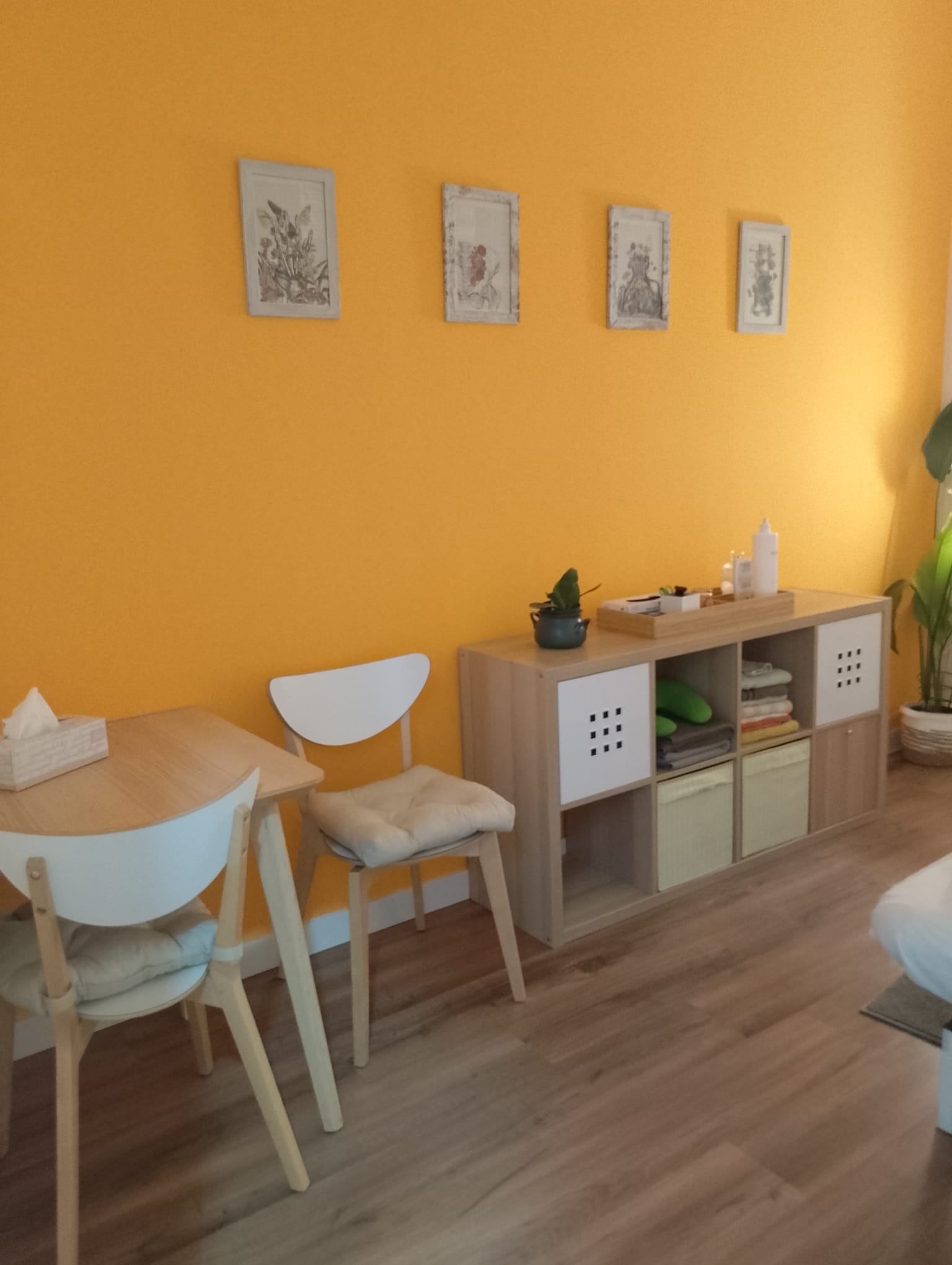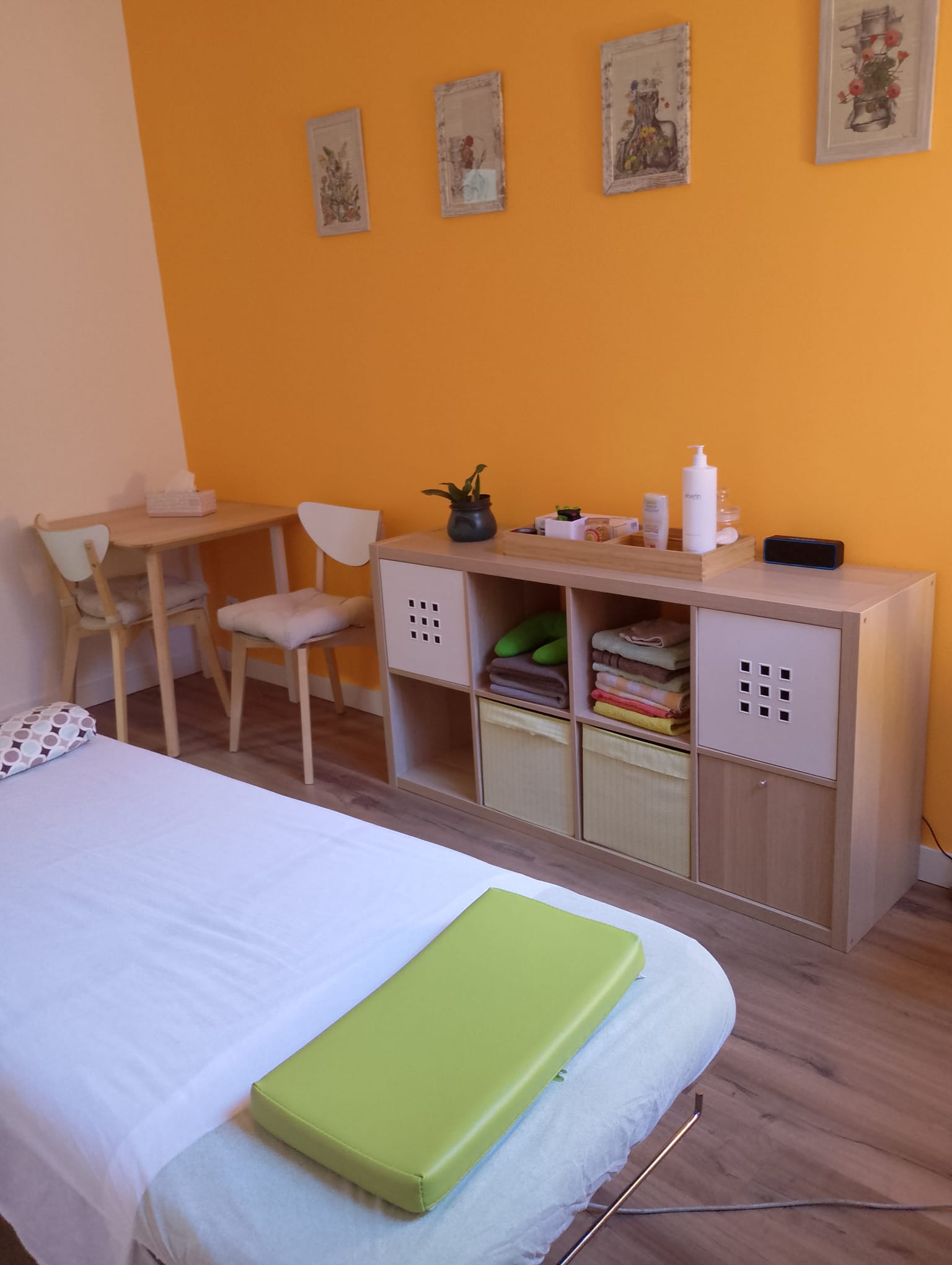 Esta sala, de tamaño más reducido, está diseñada para ofrecer un ambiente íntimo y funcional, ideal para sesiones de masajes y terapias individuales. Dispone de una camilla profesional, una mesa auxiliar y una silla, además de un perchero y un banco de madera que aportan practicidad y comodidad tanto para el profesional como para el cliente. También cuenta con lavabo propio, facilitando la higiene durante la actividad.