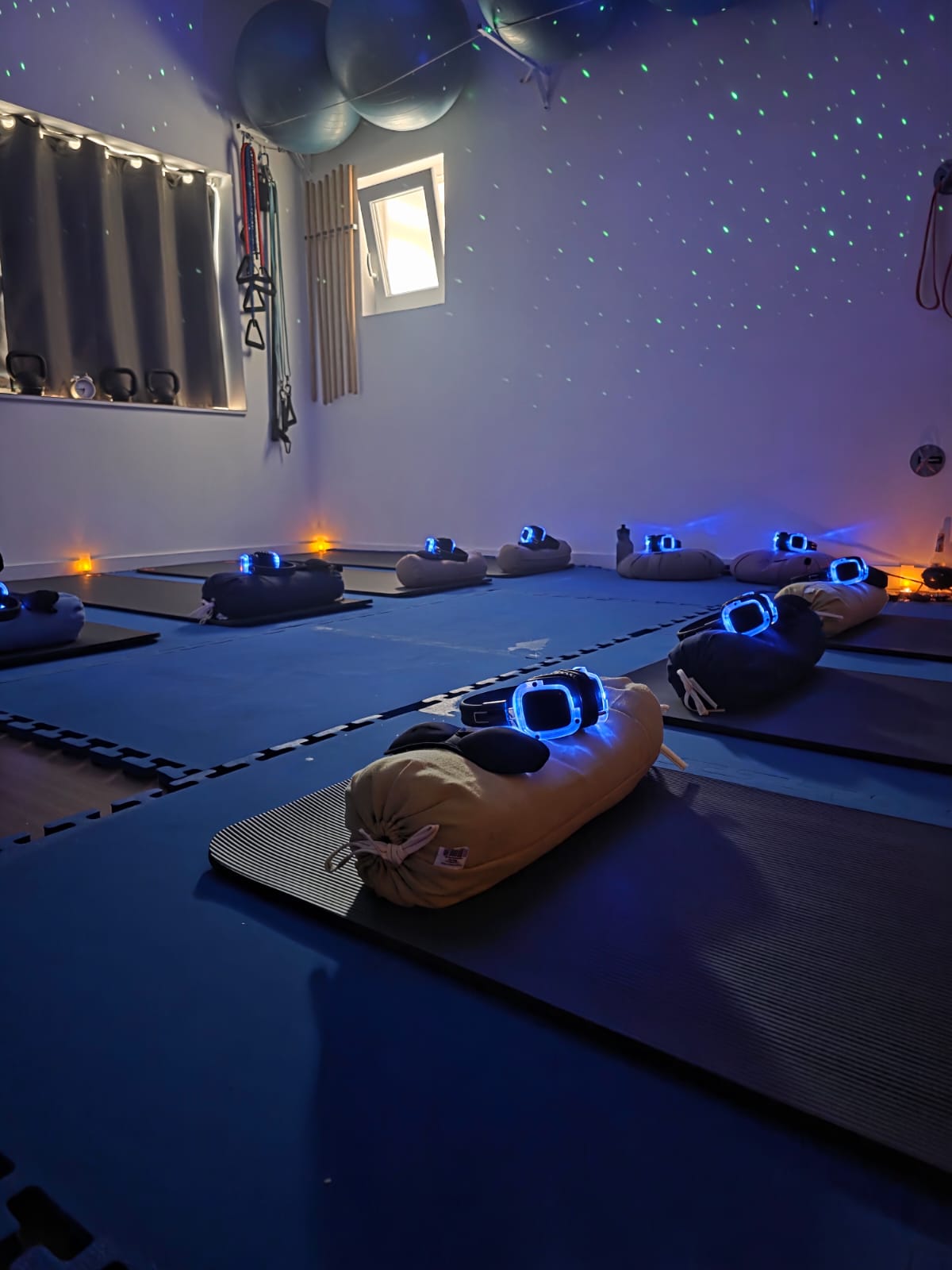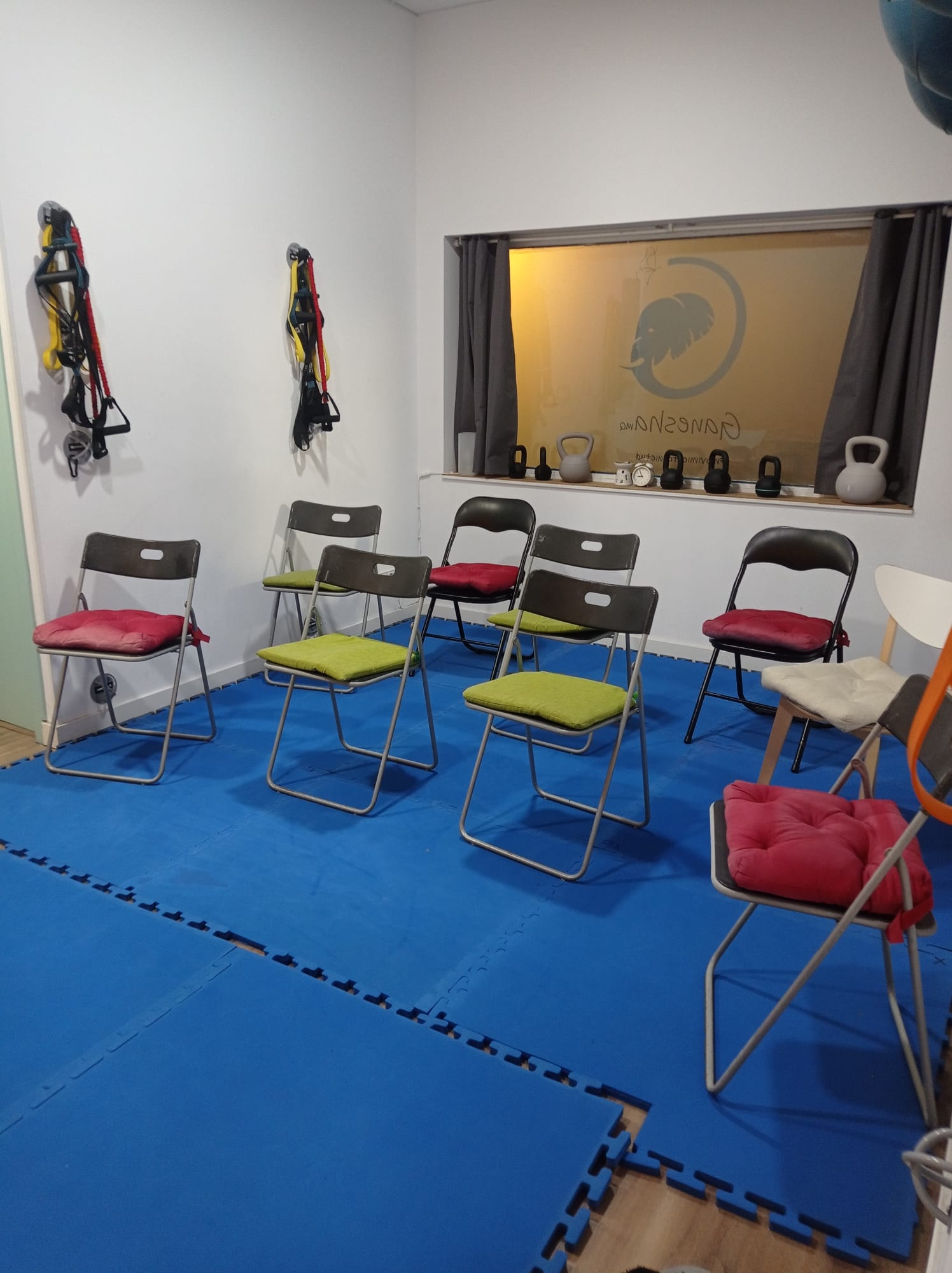 La sala dispone de colchonetas, cojines, mantas y material de Pilates, facilitando la práctica de actividades corporales, de relajación o bienestar. El suelo cuenta con un tatami que aporta calidez y confort, permitiendo trabajar descalzo sin sentir el frío.